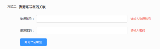 第三步:绑定资源账号:点击右上角头像,点击左侧绑定资源账号,选择类型二:输入账号密码,点击“账号密码绑定”