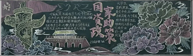 黑板报内容围绕着国家资助政策向广大学生宣传相关知识,让国家资助政策跃然于画面中,生动形象地展现出资助政策的光辉,表达了学生对国家资助政策的感恩之情与励志成才之心,充分发挥了资助育人的双重成效。