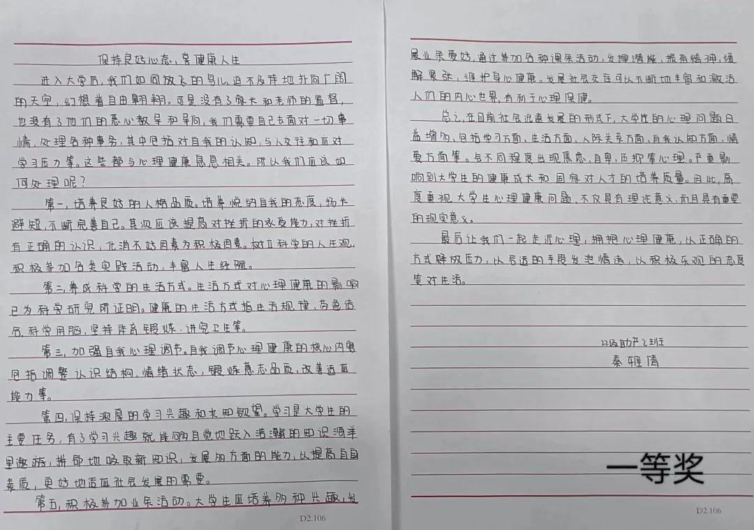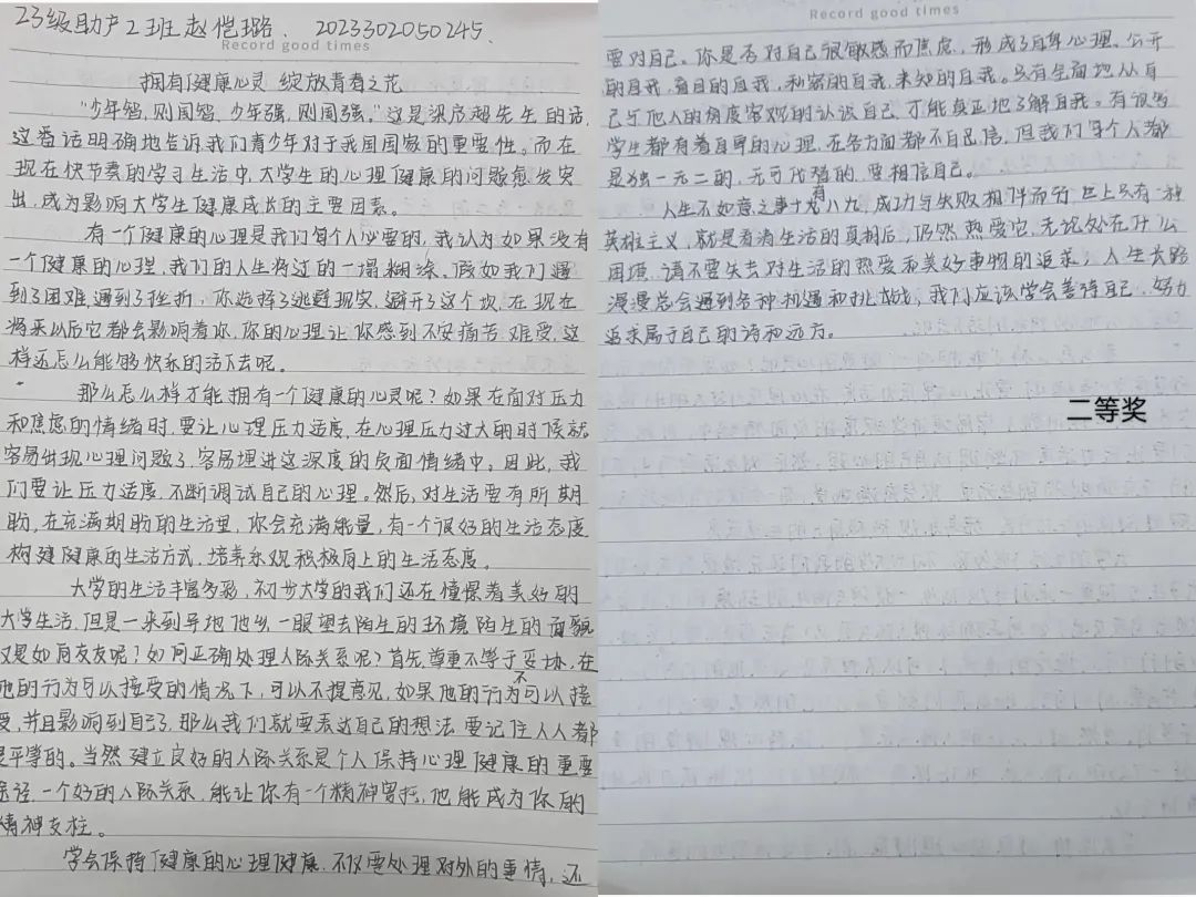 通过本次征文比赛,不仅让同学们回顾了个人的心路成长历程,让其以挫折为成长的养分,从他人的帮助中汲取动力,在自我调适中认识自我,也有利于提高青年学子自我调控、承受挫折、适应环境的能力,培养其健全的人格和良好的个性心理品质,发展心理潜能。