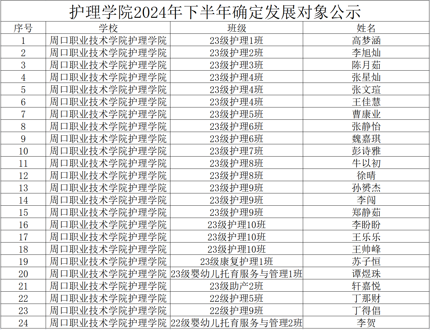 据《中国共产主义青年团章程》《校团委关于开展2024年新发展团员工作的通知》中有关规定发展团员工作相关要求。经学生自愿提出申请、学院团组织审核、推荐,并经校团委审核后,现将2024年下半年确定发展对象人选进行公示,公示结果如下: