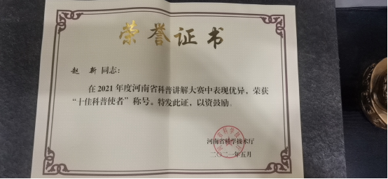 在5月15日结束的2021年度河南省科普讲解大赛中,赵新老师代表周口市参赛并荣获一等奖,创我市在此项赛事的最好成绩。