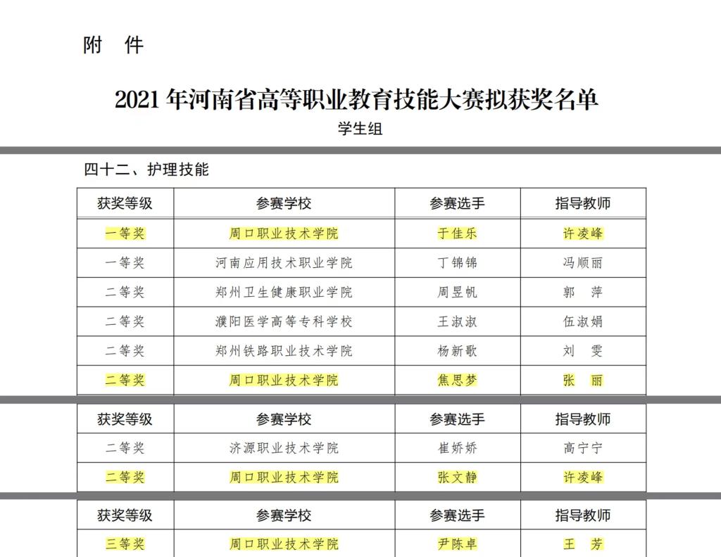 近日,河南省教育厅公示了2021年河南省高等职业教育技能大赛拟获奖名单,我院参赛学生成绩喜人,荣获一等奖1项,二等奖2项,三等奖1项。