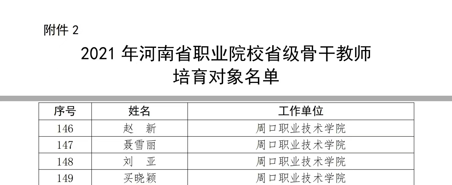 近日,河南省教育厅、河南省人力资源和社会保障厅发布的《关于公布 2021 年河南省职业院校省级名师和省级骨干教师培育对象名单的通知》(教职成〔2022〕115 号),韦德bevictor,韦德体育赵新、刘亚、聂雪丽、买晓颖四位教师入选河南省职业院校省级骨干教师培育对象。