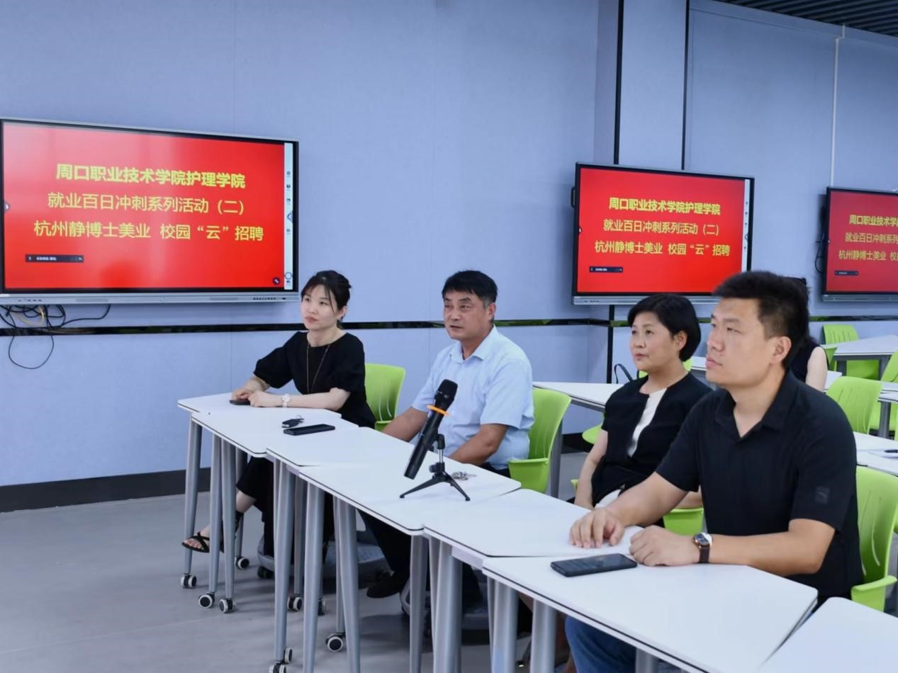 杭州静博士美业集团校企合作负责人董俊进行线上宣讲,实地介绍了企业的发展和产品项目、工作环境和薪酬待遇、人才需求和培养机制等,并发布就业岗位、招聘计划等,向更多的同学发出加入企业的诚挚邀请。
